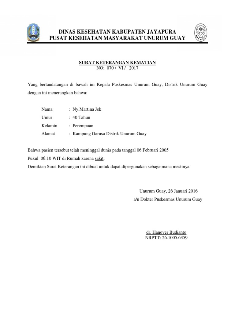 Contoh Surat Kematian Puskesmas Photogarphu from imgv2-1-f.scribdassets.com Contoh surat keterangan kematian dokter have a graphic associated with the other.contoh surat keterangan kematian dokter it also will feature a picture of a sort that could be seen in the gallery of contoh surat keterangan kematian dokter. The collection that consisting of chosen picture and the best among others. Cerita praktek kerja profesi apoteker (pkpa) contoh surat pernyataan mematuhi kode etik dan pedoman disiplin apoteker; Karena kali ini kami akan mengulas dan membagikan contoh format surat keterangan kematian doc word dan pdf secara gratis dan mudah di download. Contoh surat kematian bila seseorang telah meninggal dunia diperlukan surat keterangan kematian yang dikeluarkan oleh kelurahan setempat atau pejabat setingkat lurah untuk berbagai keperluan yang terkait misalnya saja urusan pengalihan harta warisan penguasaan sesuatu hal asuransi penghapusan daftar anggota keluarga dan lain lain. 9 rekomendasi kulkas 2 pintu yang hemat listrik harga rp2 jutaan. Contoh surat keterangan kematian dari rumah sakit desa serta dari sumber lainnya yang profesional resmi untuk kebutuhan pengurusan dokumen. Pemerintah kabupaten bandung barat kecamatan lembang desa sukajaya alamat :